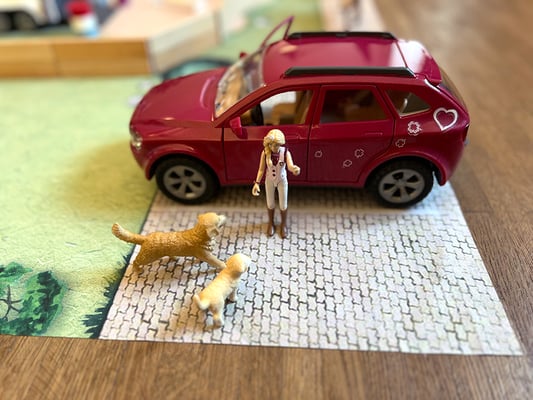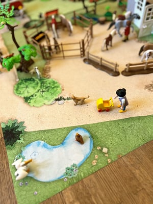 Die Spiel-Unterlage ist abgestimmt auf viele beliebte Playmobil- und Lego-Sets und offen für unzählige Szenarien: Vom Streichelzoo, zum Freizeitpark bis zum Kita-Alltag. Optimal